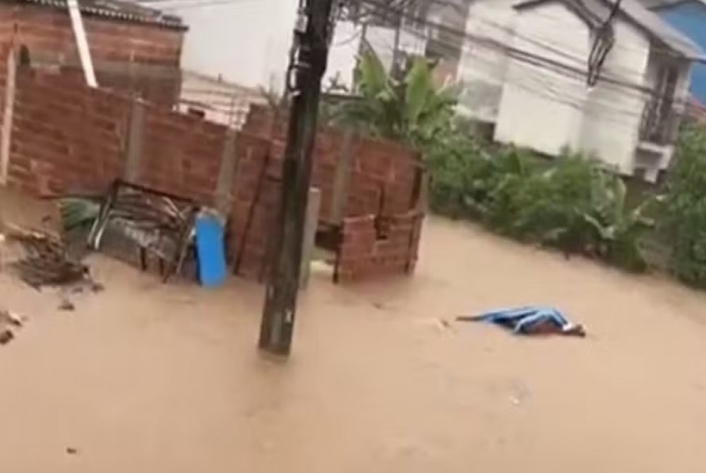 Numa das imagens, moradores estão na rua em meio a uma correnteza causada pelo temporal e usam uma corda para evitarem ser arrastados. De acordo com moradores, um dos bairros mais afetados é o Condado.